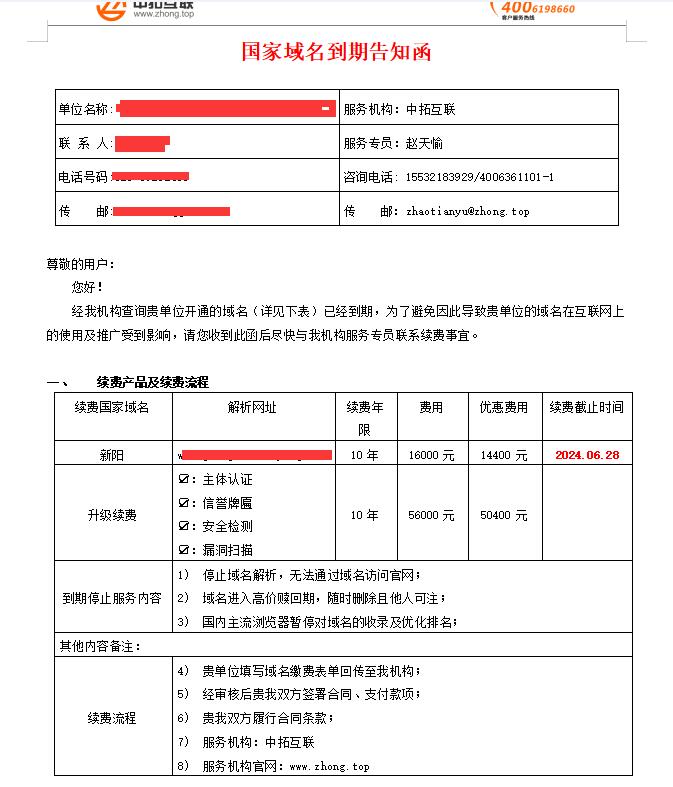 提醒廣大客戶警惕中拓互聯(lián)國家域名到期續(xù)費套路
